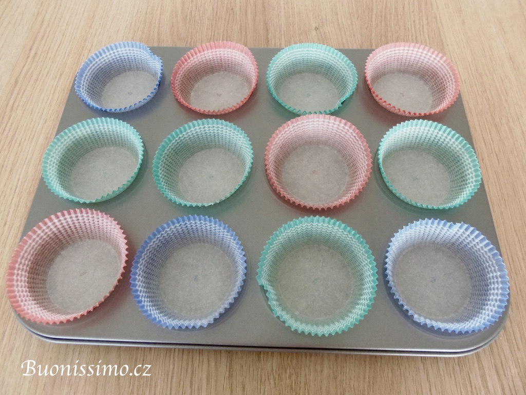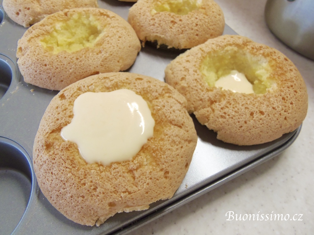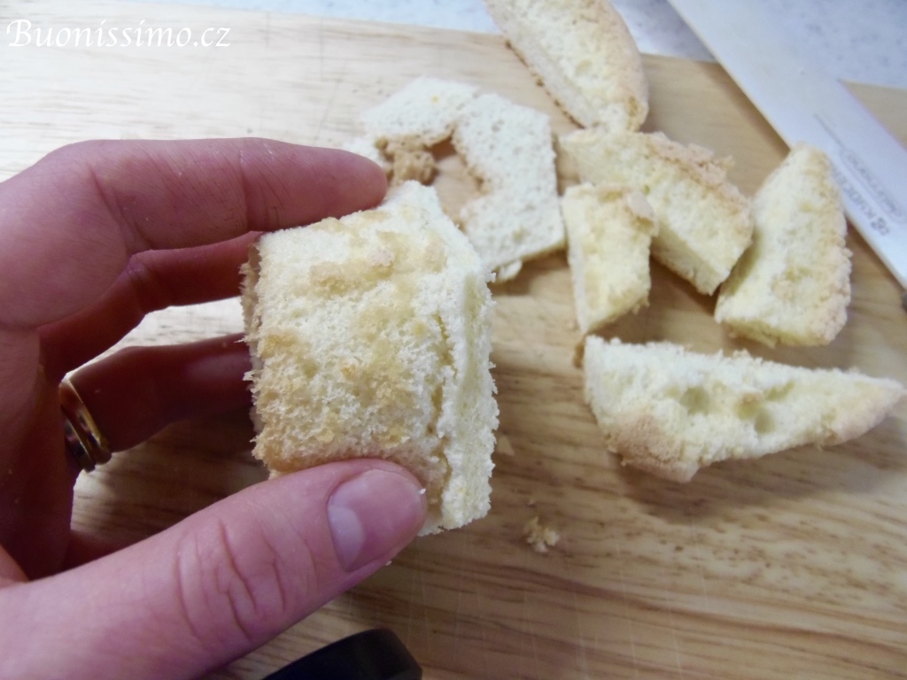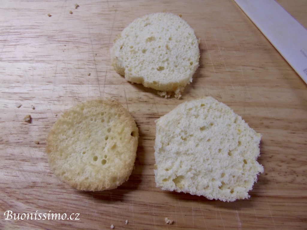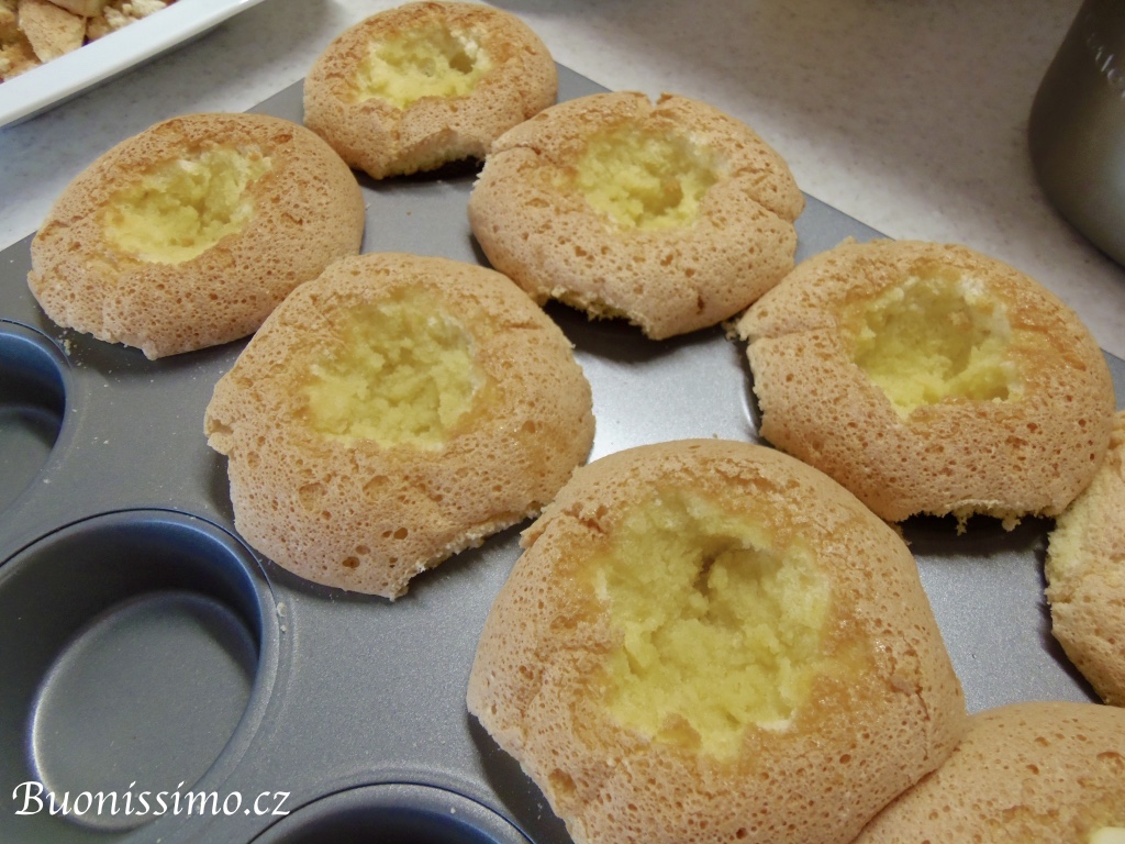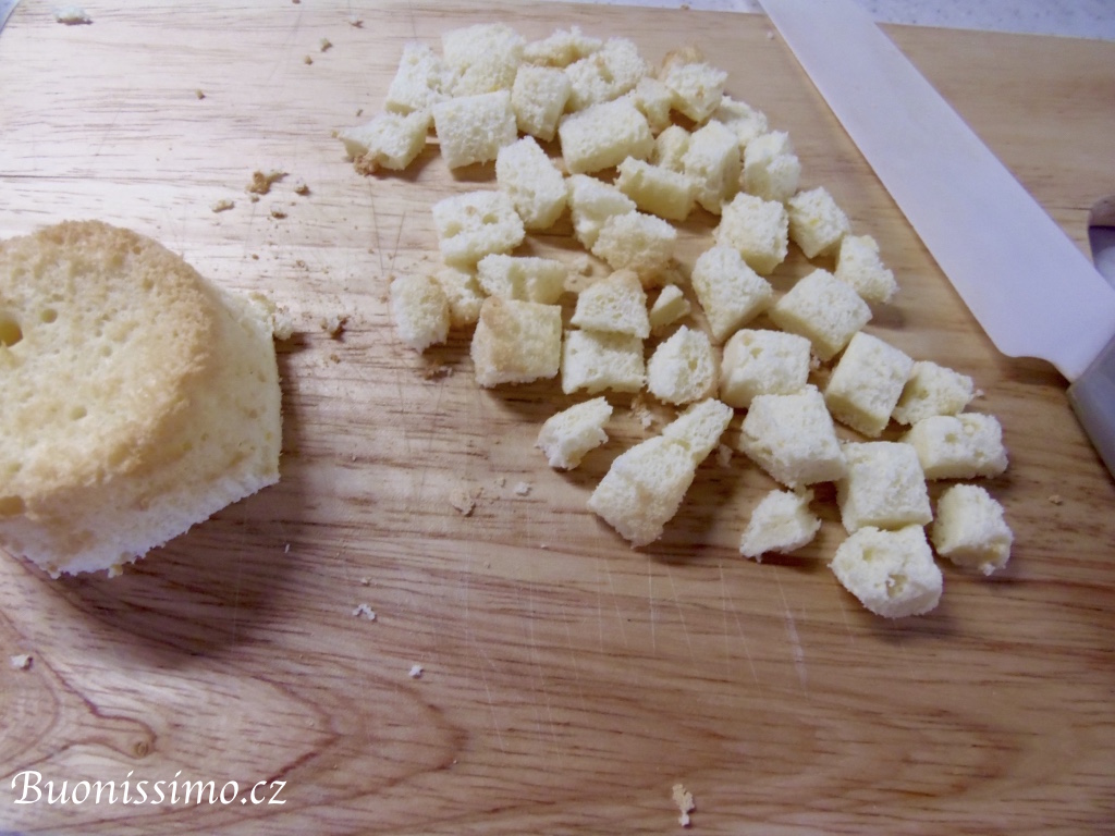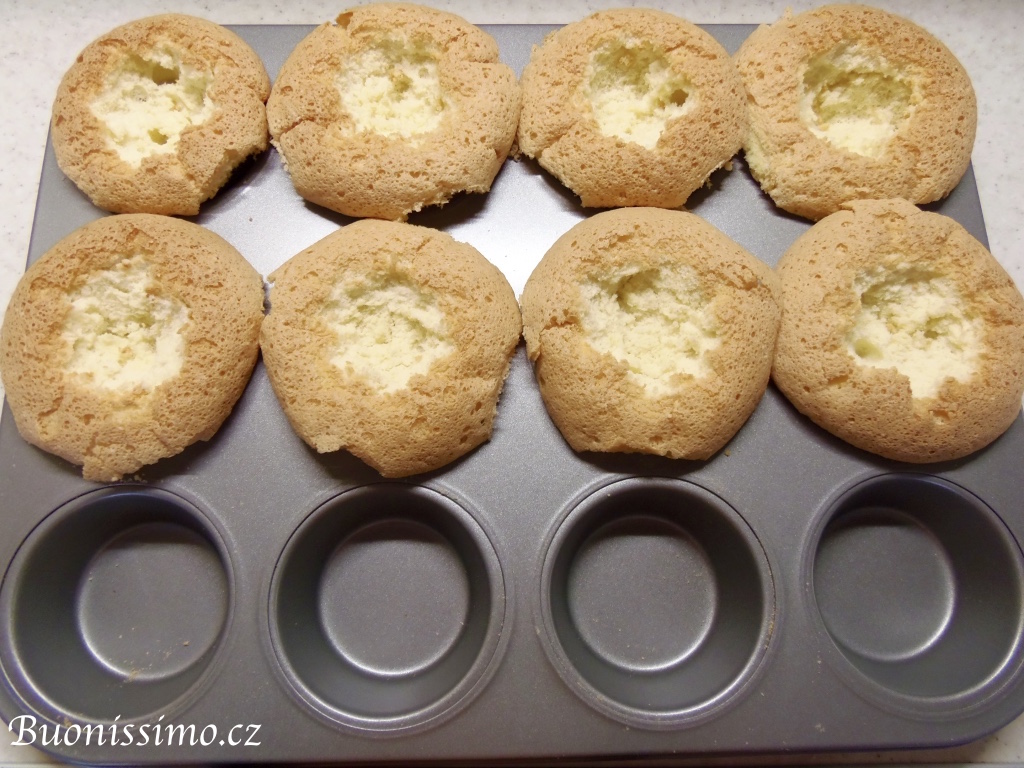 Čtyři muffiny z dvanácti rokrájíme na kostičky dle postupu viditelného na fotografiích. Snažíme se odstranit hnědou kůrčičku a nakrájet jen bílou střídu. Ponecháme si ale i všechny ostatní kousíčky jako rezervu. U zbylých osm muffinů, vybereme nožem či prsty horní středovou střídu, aby vznikla jakási mistička. |