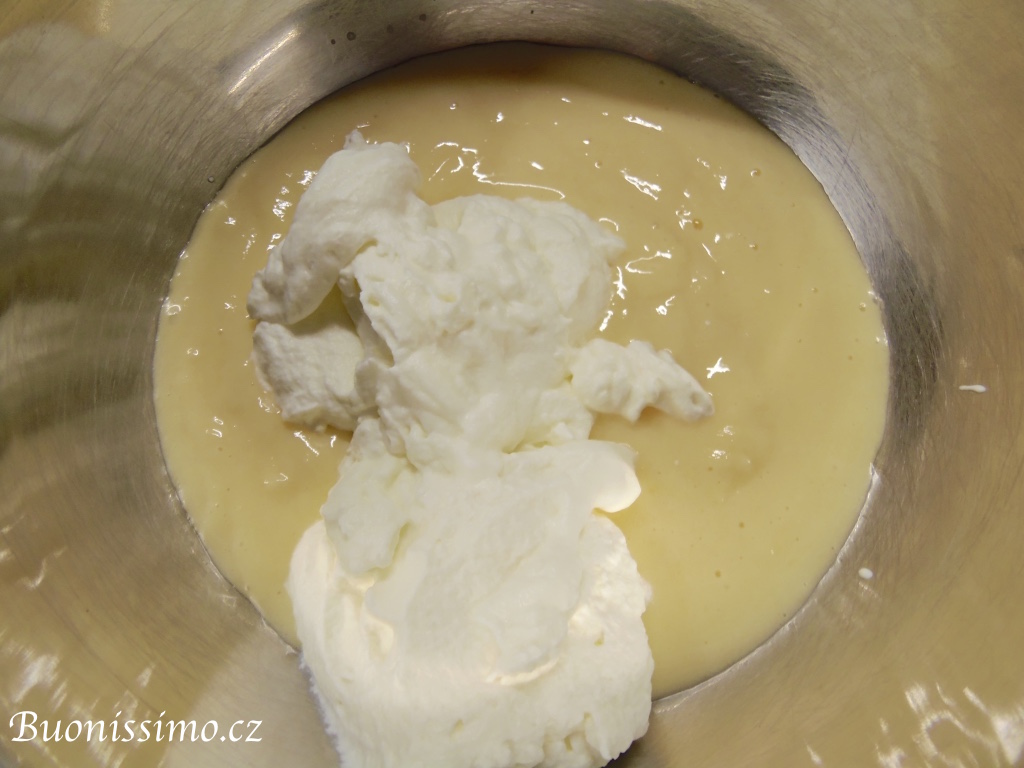 Nyní připravíme cukrářský krém z poloviny ingrediencí uvedených v odkazu zmíněném výše. Jakmile cukrářský krém vychladne, překlopíme jej do mísy. Našleháme smetanu, kterou jsme právě vyndali z lednice a pomalu ji přidáváme ke krému a ve směru odspoda vzhůru promícháváme lžící. Tímto nám vznikne diplomatický krém. |