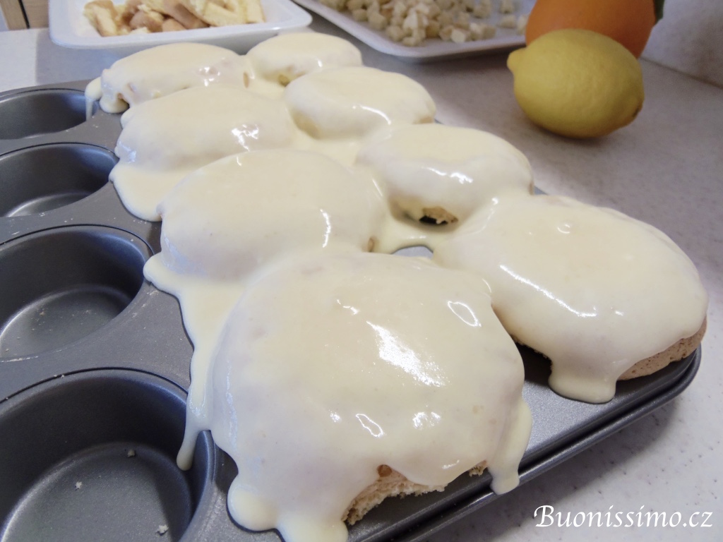 Poslední fází je plnění a zdobení. Odhalenou střídu osmi muffinů pokapeme sirupem z kůry z bio pomeranče. Poté dutinu každého z nich lžičkou naplníme diplomatickým krémem a na závěr celé hlavičky muffinů krémem přelijeme. Kostičkami a nakrájenými kousíčky nazdobíme každý muffin. Pokud si přejete dosáhnout maximální podobnosti se žlutokvětou citlivkou, můžete stejně jako já pokapat sirupem ještě vrchní kostičky a dozdobit jemně strouhanou kůrou z bio pomeranče. |