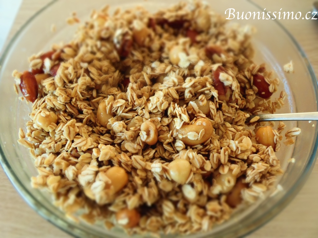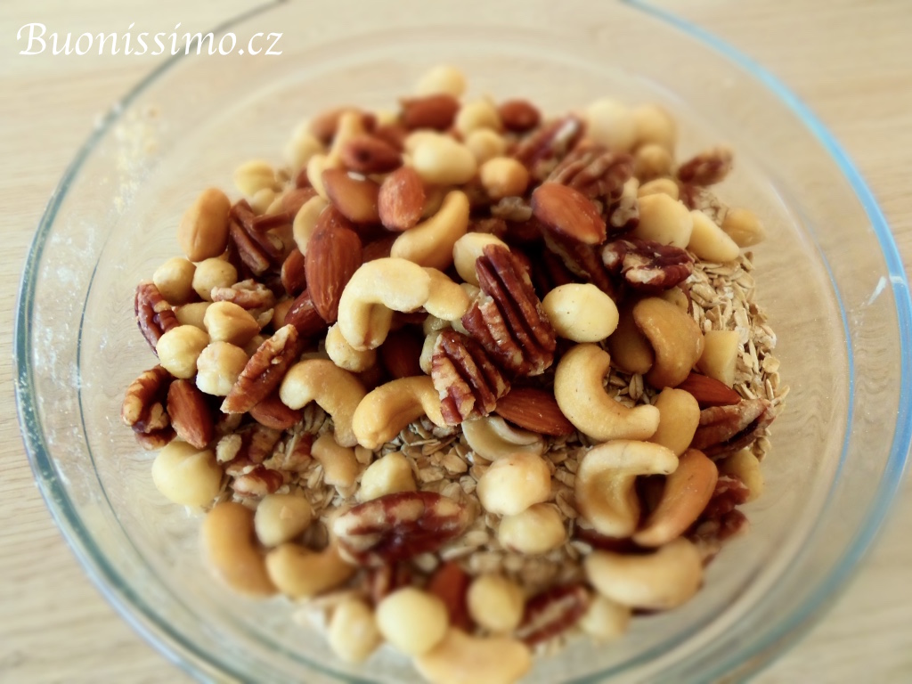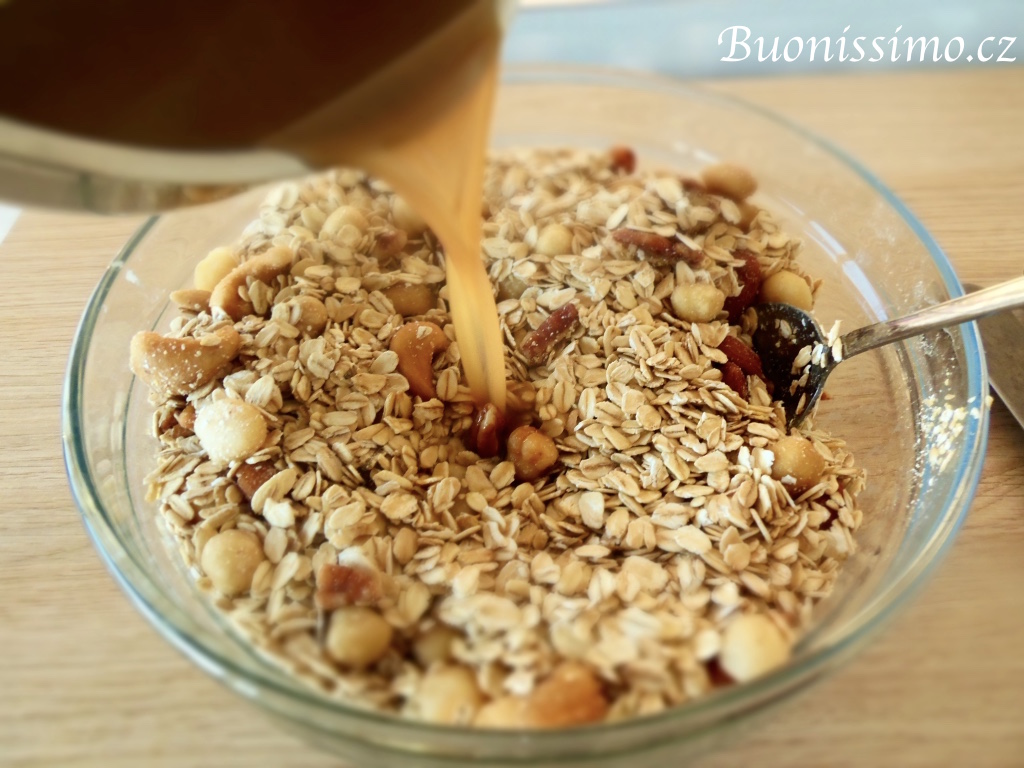Navážíme si vločky, ořechy (lískové oříšky, mandle, kešu, makadamové ořechy, pekanové ořechy) a sušené ovoce (švestky, goji, banánové chipsy, papáju, brusinky). Dle libosti některé větší kusy těchto ingrediencí můžeme nakrájet. Já jsem nakrájela jen sušené švestky, zbytek jsem nechala v původním stavu. Smícháme vločky a ořechy a vlijeme náš předem připravený sirup. Dobře promícháme lžící a dovolíme, aby se vločky a ořechy sirupem slepily. |