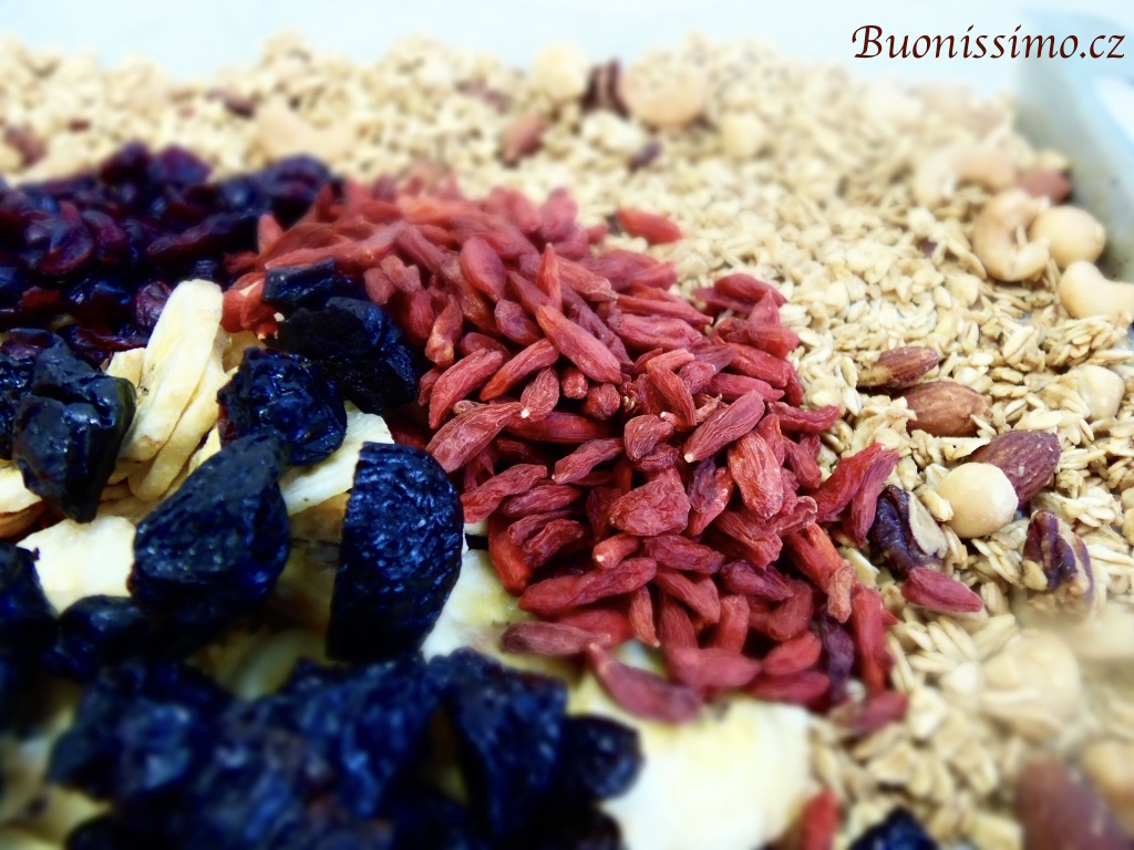 Granola je směs ovesných či ječných vloček, oříšků a sušeného ovoce. Aby nebyla konzistence granoly pouze sypká a zvýšil se chuťový vjem, přidá se med či javorový sirup nebo sirup z agáve, voda a olej příjemné chuti. Já Vám představím jednu z podob granoly, ve které jsou použity pouze rostlinné ingredience. Rozhodla jsem se připravit variantu s ovocem goji.