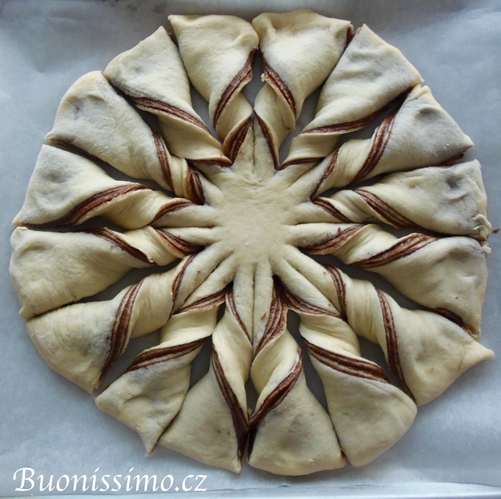 Po dvou hodinách bochník rozdělíme na 4 stejně velké kusy. S jedním z nich začneme a zbylé tři zatím dáme stranou. První kus těsta vykoulíme a rozválíme tak, abychom obdrželi tenkou placku o průměru 29 cm, kterou přeneseme na plech s pečícím papírem. Pomažeme rovnoměrně a až k okraji tenkou vrstvu Nutelly. Vezmeme si další kus těsta, vytvarujeme ho do kuličky a rozválíme. Vrstvu Nutelly tímto vyváleným těstem překryjeme. Navrch opět rozetřeme Nutellu v tenké vrstvě. Opakujeme proces s dalším kusem těsta, rozetřením Nutelly. Poslední vrstvou je těsto. Celkem tedy máme 4 vrstvy těsta a 3 vrstvy Nutelly. Dobře uzavřeme okraj kolem dokola budoucího květu. |