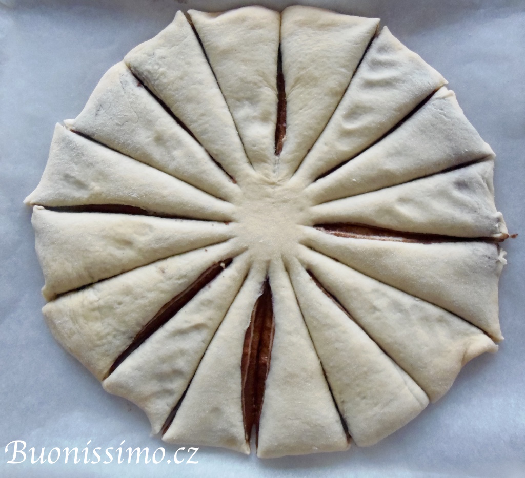 Poté si vezmeme dlouhý nůž a provádíme do těsta řezy tak, abychom obdrželi celkem 16 trojúhelníkových dílů se společným středem. Vždy začneme až zhruba 3 cm od středu a vedeme řez k okraji. Provedeme řez na jedné straně, pak na té protější, každý díl rozdělíme na polovinu (stále necháváme střed neporušený), ty pak na další polovinu, nyní je jich 8, každý z nich tedy ještě jednou rozpůlíme. Dostaneme 16 dílů se společným středem o průměru 6 cm. |