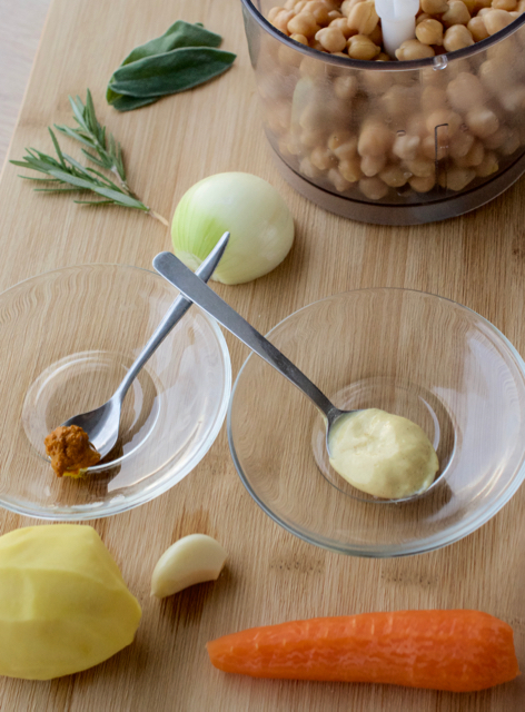 Bramboru a mrkev po uvaření nakrájíme na menší kousky, stejně tak i cibuli a přídáme k cizrně do mixéru. V tomto okamžiku můžeme hned přidat i hořčici a kurkumu (já jsem použila kurkumovou pastu, kterou mám připravenou pro jiný recept - nápoj Latte d'oro, a skladuji ji v lednici. V rámci receptu na Latte d'oro najdete návod na přípravu kurkumové pasty. Kurkumová pasta již obsahuje pepř, proto není třeba jej do Vegan Burgeru už přidávat.) a pepř (pokud přidáváme kurkumu v prášku). Vše rozmixujeme. |
